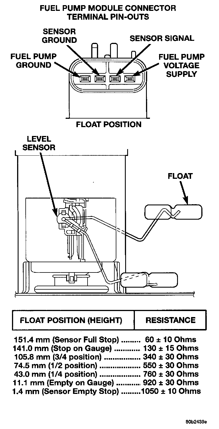 The level sensor is a variable resistor. Its resistance changes with the amount of fuel in the tank. The float arm attached to the sensor moves as the fuel level changes. To test the level sensor, connect an ohmmeter across the sensor signal and sensor ground terminals of the fuel pump module connector. Move the float lever to the positions shown in the resistance chart. Record the resistance at each point. Replace the level sensor if the resistance is not within specifications.