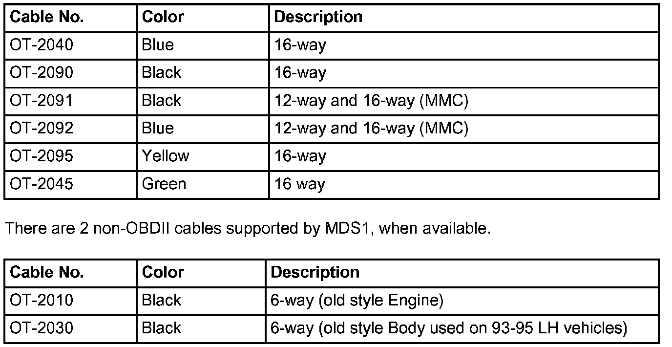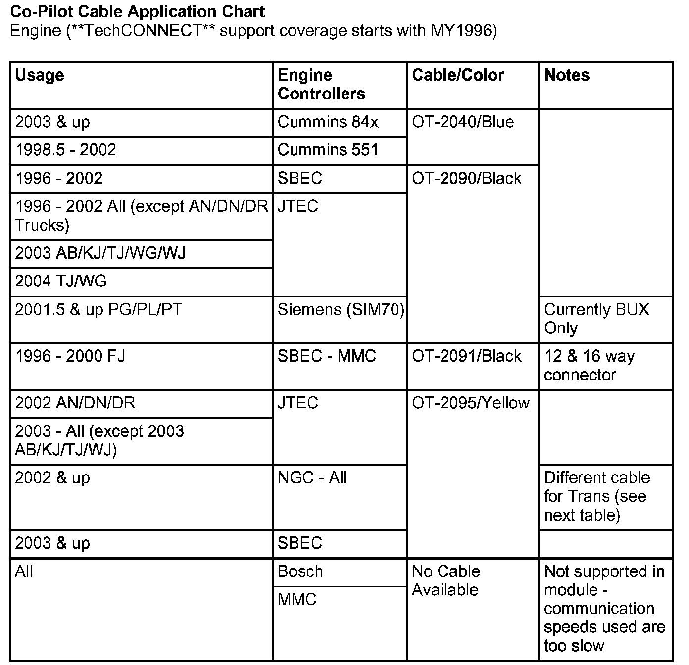 Co-Pilot is an optional diagnostic tool for the dealership or workshop. Because of this, please review the cables shown listed and the appropriate application or usage chart shown.
