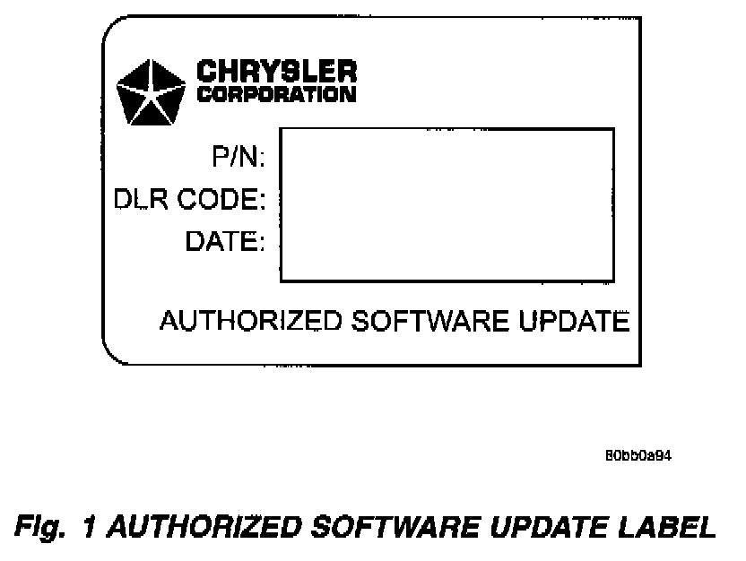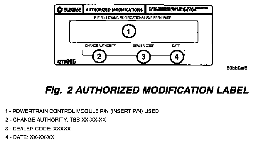 7. Type the necessary information on the "authorized Software Update Label" p/n 04669020 (Fig. 1). Attach the label to the PCM and cover the label with the clear plastic overlay.