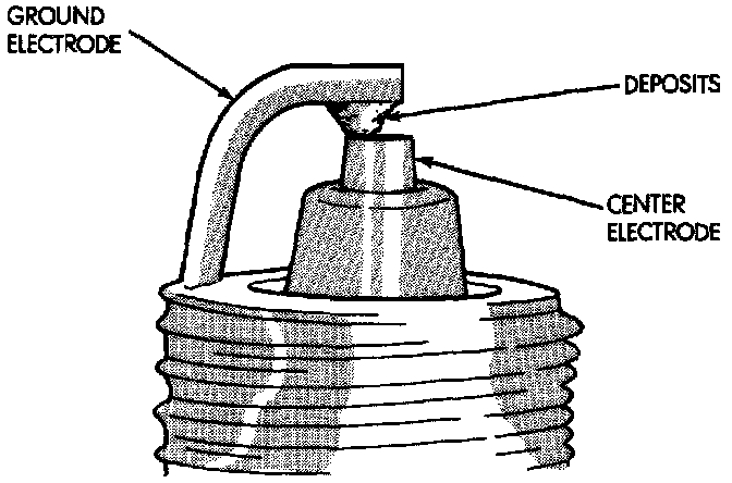 Loose deposits in the combustion chamber can cause electrode gap bridging. The deposits accumulate on the spark plugs during continuous stop-and-go driving. When the engine is suddenly subjected to a high torque load, the deposits partially liquefy and bridge the gap between the electrodes. This short circuits the electrodes. Spark plugs with electrode gap bridging can be cleaned and reused.