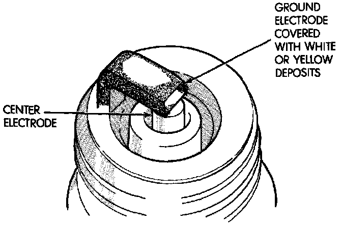 Fuel scavenger deposits may be either white or yellow. They may appear to be harmful, but are a normal condition caused by chemical additives in certain fuels. These additives are designed to change the chemical nature of deposits and decrease spark plug misfire tendencies. Notice that accumulation on the ground electrode and shell area may be heavy but the deposits are easily removed. Spark plugs with scavenger deposits can be considered normal in condition, cleaned and reused.