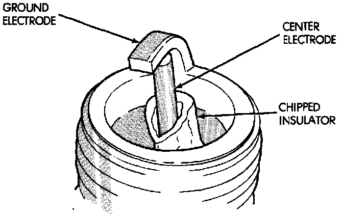 A chipped electrode insulator usually results from bending the center electrode while adjusting the spark plug electrode gap. Under certain conditions, severe detonation also can separate the insulator from the center electrode. Spark plugs with chipped electrode insulators must be replaced.