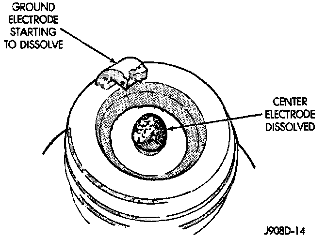 Excessive combustion chamber temperature can cause preignition damage. First, the center electrode dissolves and the ground electrode dissolves somewhat later. Insulators appear relatively deposit free. Determine if the spark plugs are the correct type, as specified on the VECI label, or if other operating conditions are causing engine overheating.