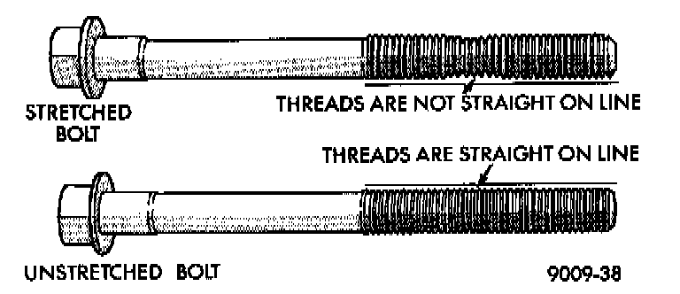 The cylinder head bolts are tightened using a torque-to-yield procedure. The bolts must be examined BEFORE reuse. If the threads are necked down the bolts should be replaced.