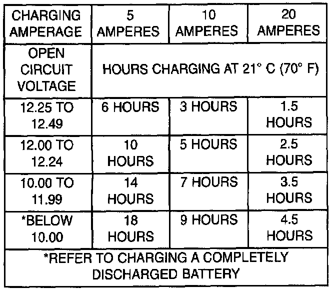 A completely discharged large heavy-duty battery may require more recharging time than a completely discharged small capacity battery Refer to Battery Charging Timetable.