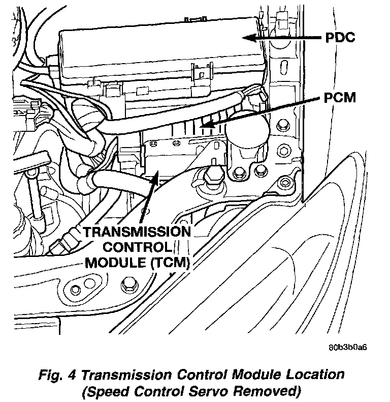 The Transmission Control Module (TCM) is located in the engine compartment on the left (driver's) side between the Power Distribution Center (PDC) and headlamp (Fig. 4). It is mounted below the Speed Control Servo next to the Powertrain Control Module (PCM) on its own bracket.