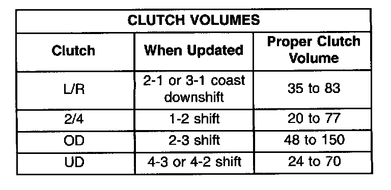 Certain mechanical problems within the input clutch assembly (broken return springs, out of position snap rings, excessive clutch pack clearance, improper assembly, etc.) can cause inadequate or out-of-range element volumes. Also, defective Input/Output Speed Sensors and wiring can cause these conditions. The following chart identifies the appropriate clutch volumes and when they are monitored/updated: