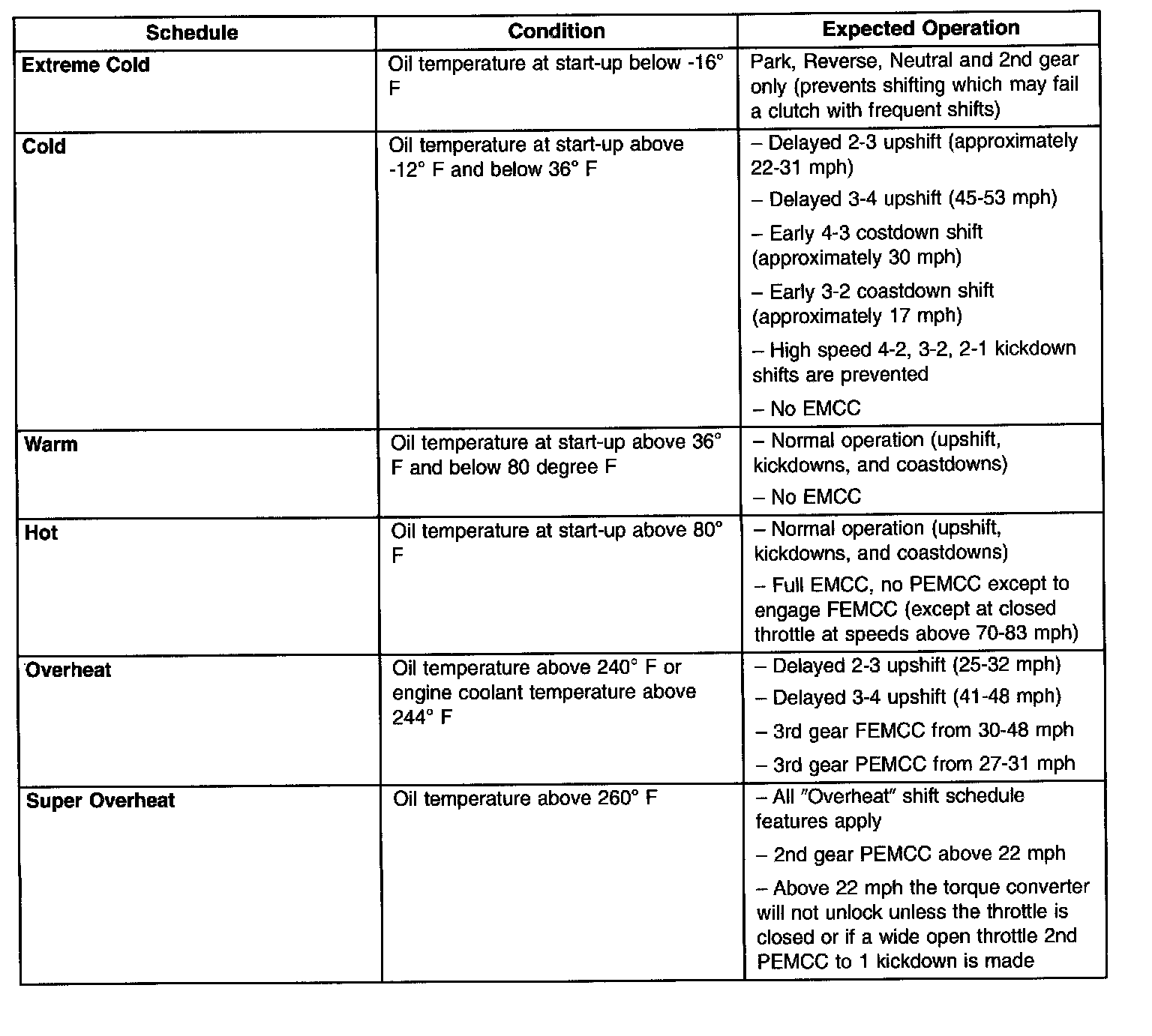 As driving conditions change, the TCM appropriately adjusts the shift schedule. Refer to the following chart to determine the appropriate operation expected, depending on driving conditions.