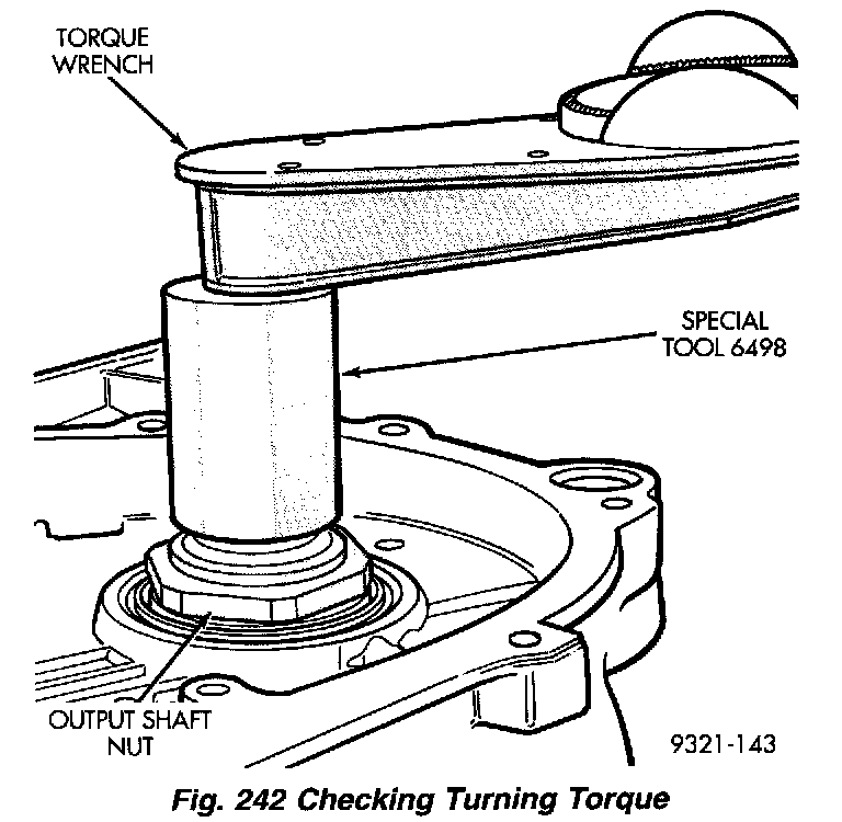 7. Check the turning torque of the output shaft (Fig. 242). The shaft should have 1 to 8 inch lbs. of turning torque. If the turning torque is higher than 8 inch lbs., install a thicker shim. If the turning torque is less than 1 inch lbs., install a thinner shim. Make sure there is no end play.