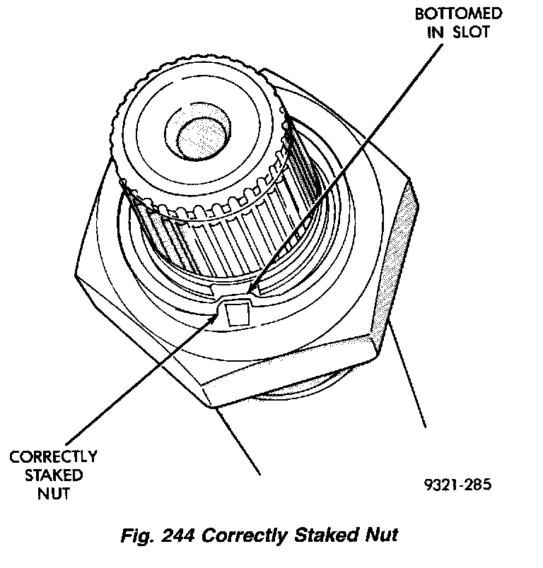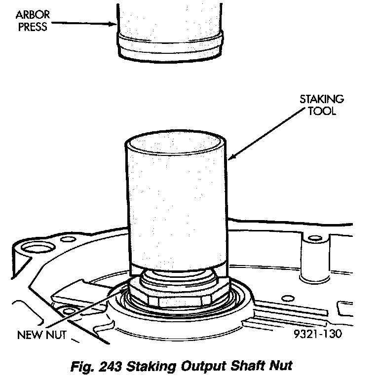 8. The new nut must be staked after the correct turning torque is obtained (Fig. 243). Use special tool. 6639 to stake output shaft nut and special tool 6589 to stake transfer shaft.