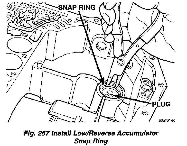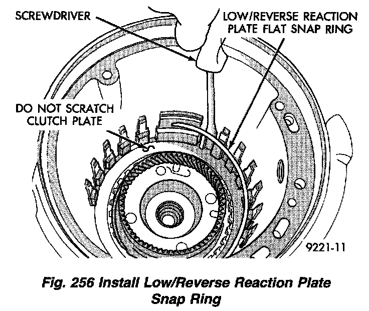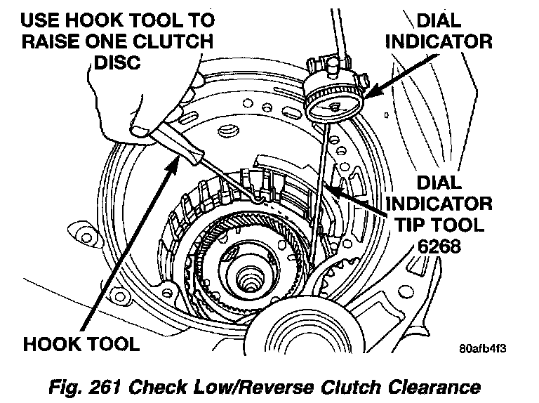 Press down clutch pack with finger and zero dial indicator. Low/Reverse clutch pack clearance is 0.89 to 1.04 (0.035 to 0.042 inch).