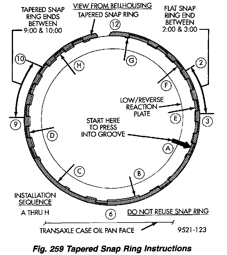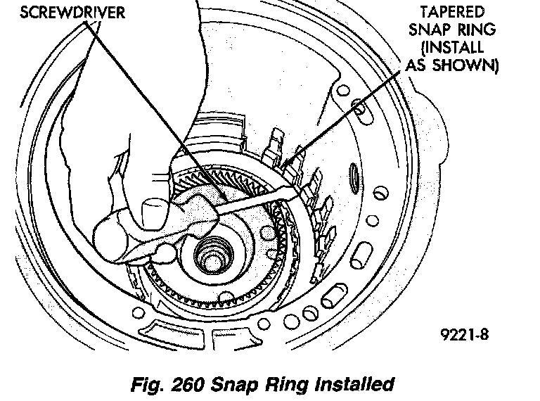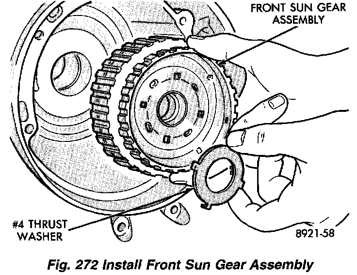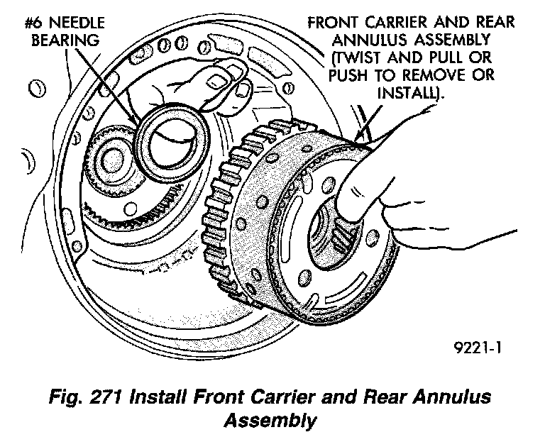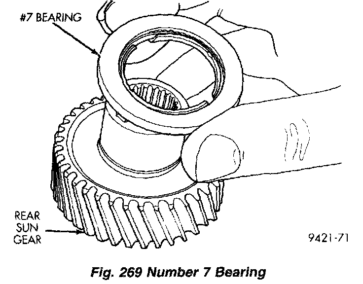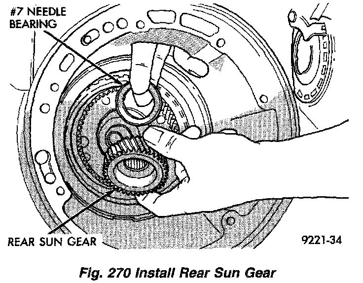 The number 7 needle bearing has antireversal tabs and is common with the number 5 and number 2 position. The orientation should allow the bearing to seat flat against the rear sun gear (Fig. 269). A small amount of petrolatum can be used to hold the bearing to the rear sun gear.