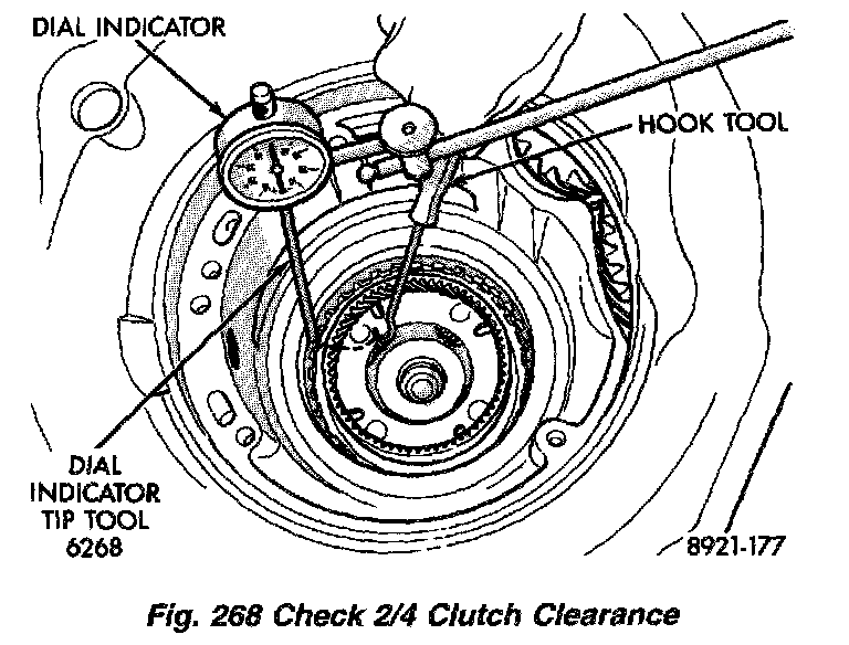 Press down clutch pack with finger and zero dial indicator. The 2/4 clutch pack clearance is 0.76 to 2.64 mm (0.030 to 0.104 inch). If not within specifications, the clutch is not assembled properly. There is no adjustment for the 2/4 clutch clearance.