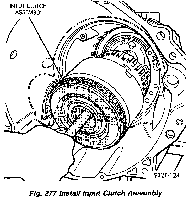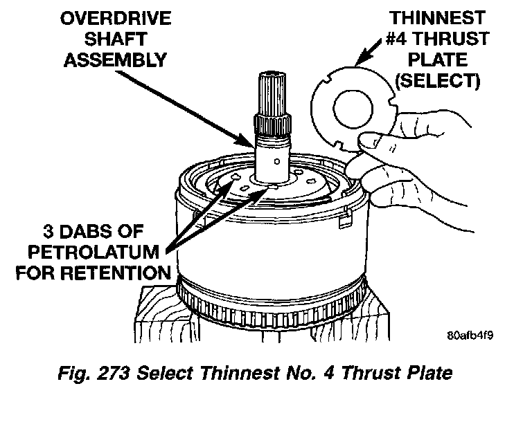 To determine the proper thickness of the No. 4 thrust plate, select the thinnest No. 4 thrust plate. Using petrolatum (Fig. 273) to hold thrust plate in position, install input clutch assembly. Be sure the input clutch assembly is completely seated (Fig. 274),