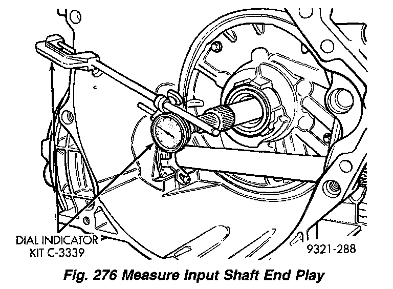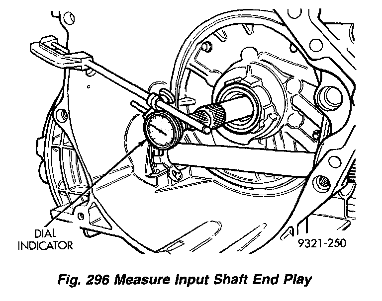 As a final check of the transaxle, measure the input shaft end play. This will indicate when a #4 thrust plate change is required. The number 4 thrust plate is located behind the overdrive clutch hub.. Attach a dial indicator to transaxle bell housing with its plunger seated against end of input shaft (Fig. 296). Move input shaft in and out to obtain end play reading. End play specifications are 0.13 to 0.64 mm (0.005 to 0.025 inch). If not within specifications, make the necessary thrust plate adjustment.