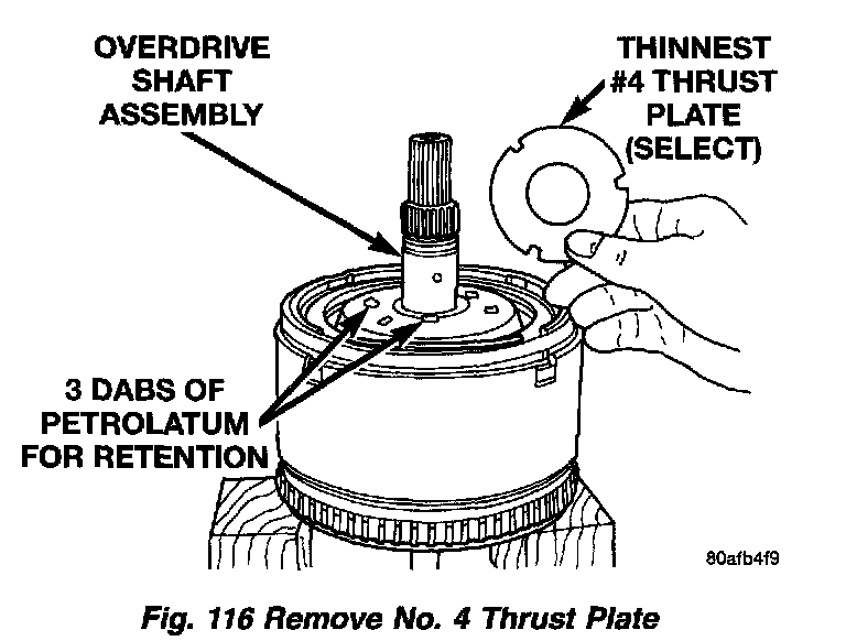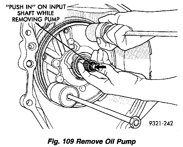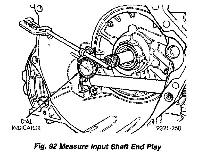 Measuring input shaft end play before disassembly will usually indicate when a #4 thrust plate change is required. The number 4 thrust plate is located behind the overdrive clutch hub. Attach a dial indicator to transaxle bell housing with its plunger seated against end of input shaft (Fig. 92). Move input shaft in and out to obtain end play reading.