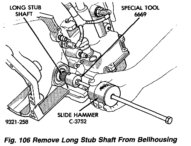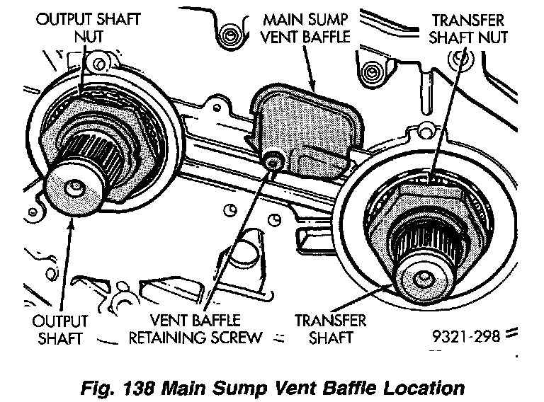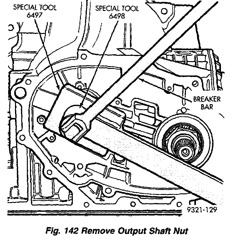 Use special tool 6497 and 6498 to remove the transfer shaft nut or the output shaft nut (Fig. 142). Note that your breaker bar will turn clockwise to remove the nut and counter clockwise to install the nut.