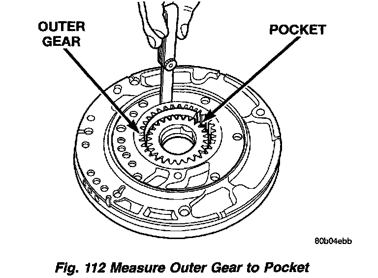 5. Measure the clearance between the outer gear and the pump pocket (Fig. 112). Clearance should be 0.045 - 0.141 mm (0.0018 - 0.0056 inch).