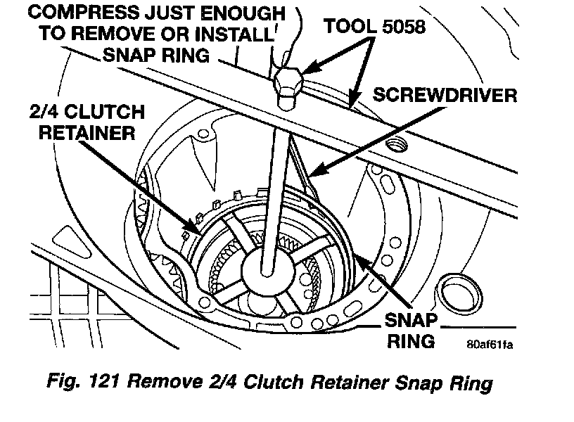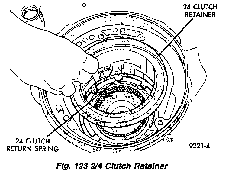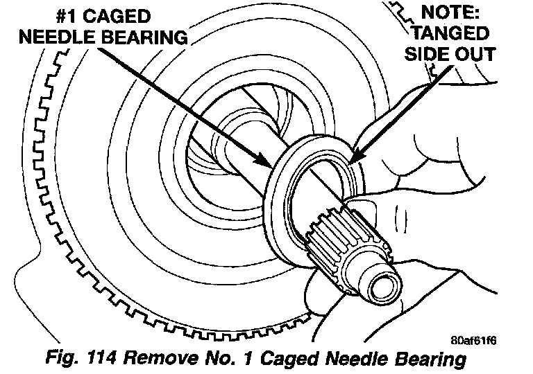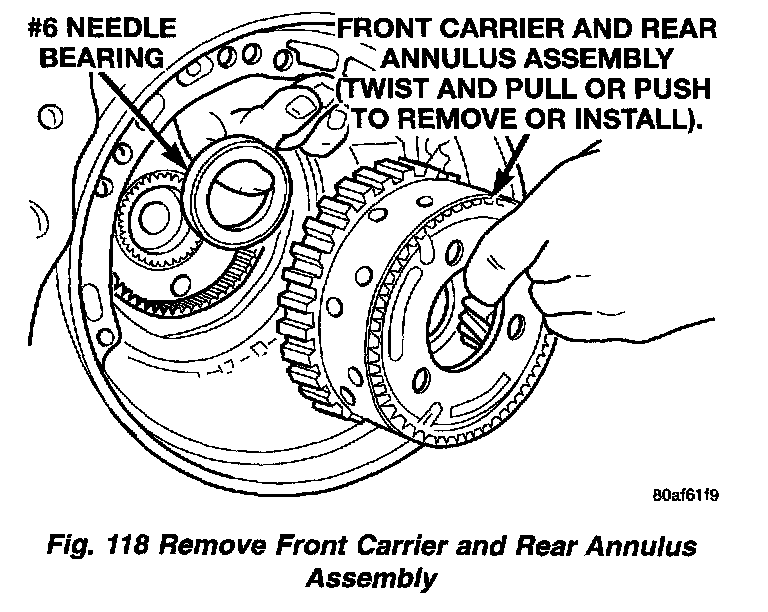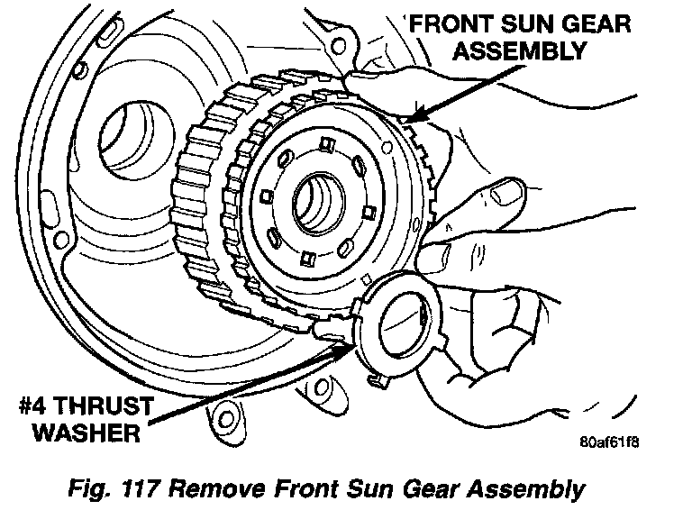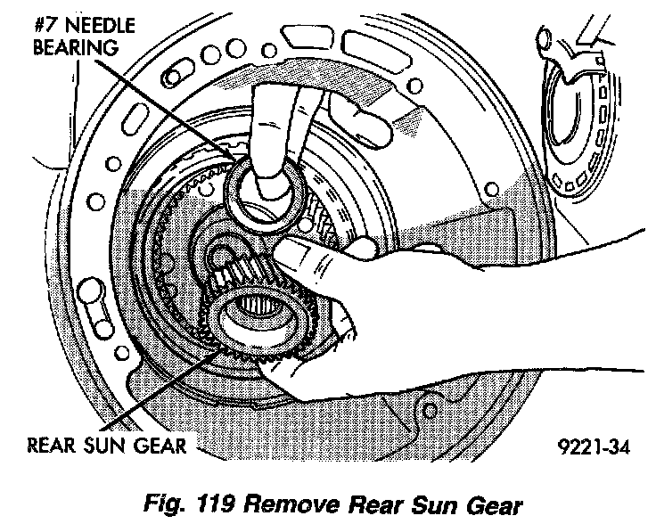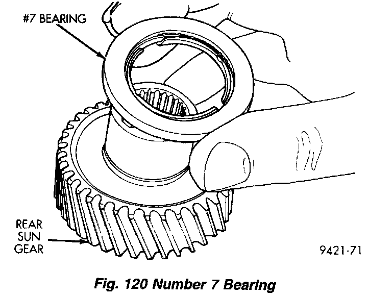 The number 7 needle bearing has antireversal tabs and is common with the number 5 and number 2 position. The orientation should allow the bearing to seat flat against the rear sun gear (Fig. 120). A small amount of petrolatum can be used to hold the bearing to the rear sun gear.