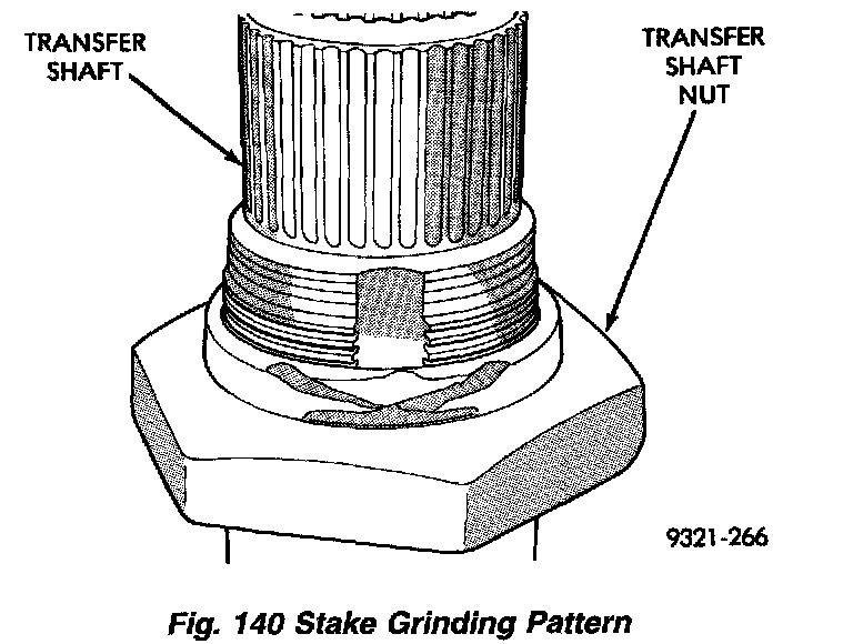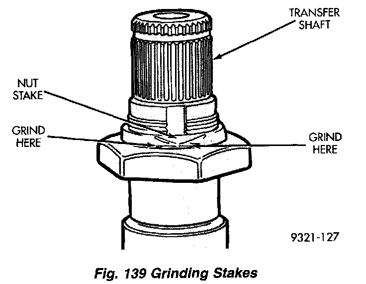 Using a die grinder or equivalent, grind the stakes in the shoulder of the shaft nuts as shown in (Fig. 139) and (Fig. 140). Do not grind all the way through the nut and into the shaft. There are two stakes on each nut.