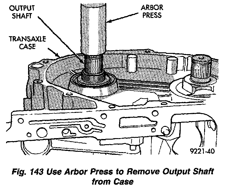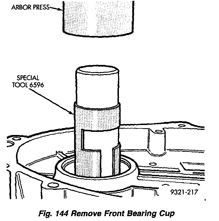 Use special tool 6596 to remove front output shaft bearing cup (Fig. 144).
