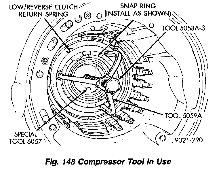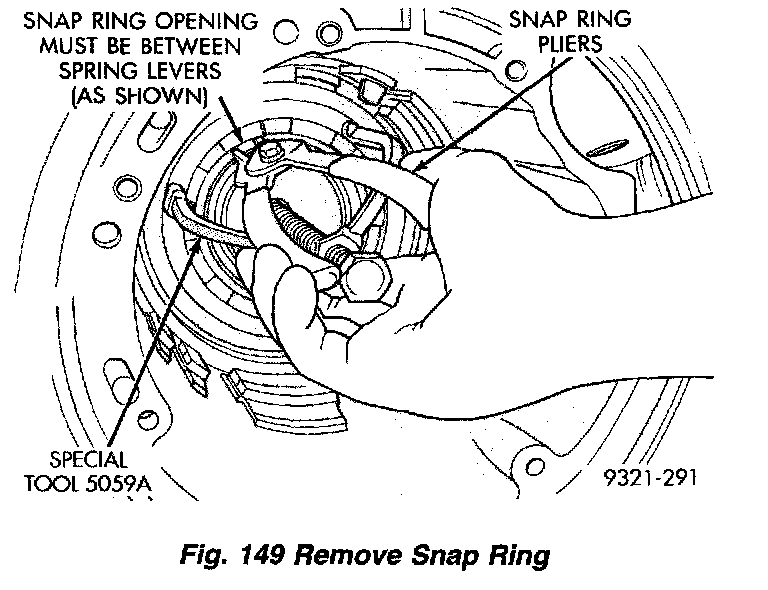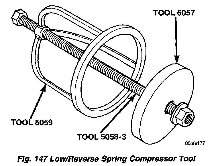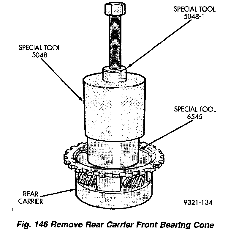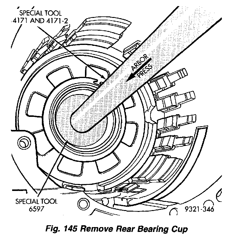 Use special tool 6597 and handle C-4171 and C-4171-2 to press rear output shaft bearing cup rearward (Fig. 145).