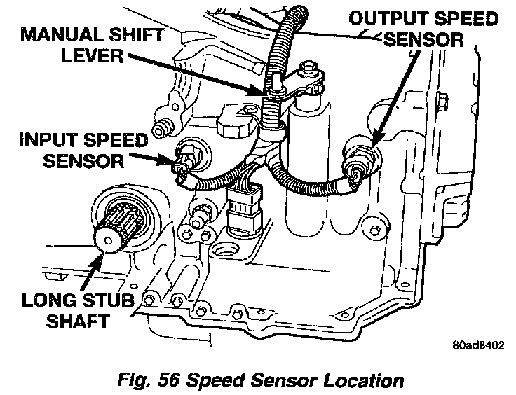 The input speed sensor is located on the left side of the transaxle case (Fig. 56). The sensor threads into the transaxle case. Tighten input speed sensor to 20-34 Nm (180-300 inch lbs.).