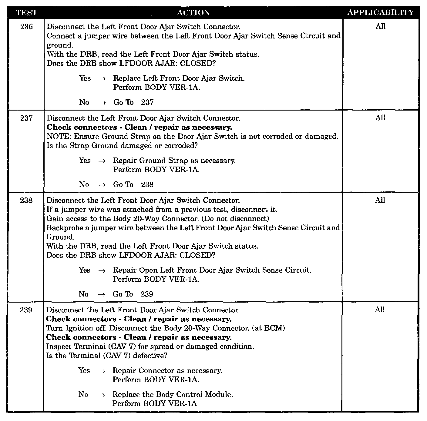 TEST NOTE: All symptoms listed above are diagnosed using the same tests. The title for the tests will be * OPEN DRIVER DOOR (LEFT FRONT) AJAR CIRCUIT.