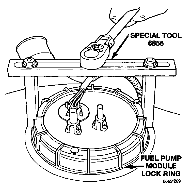 6. Using Special Tool #6856 Fuel Pump Module Ring Spanner, remove locknut to release pump module.