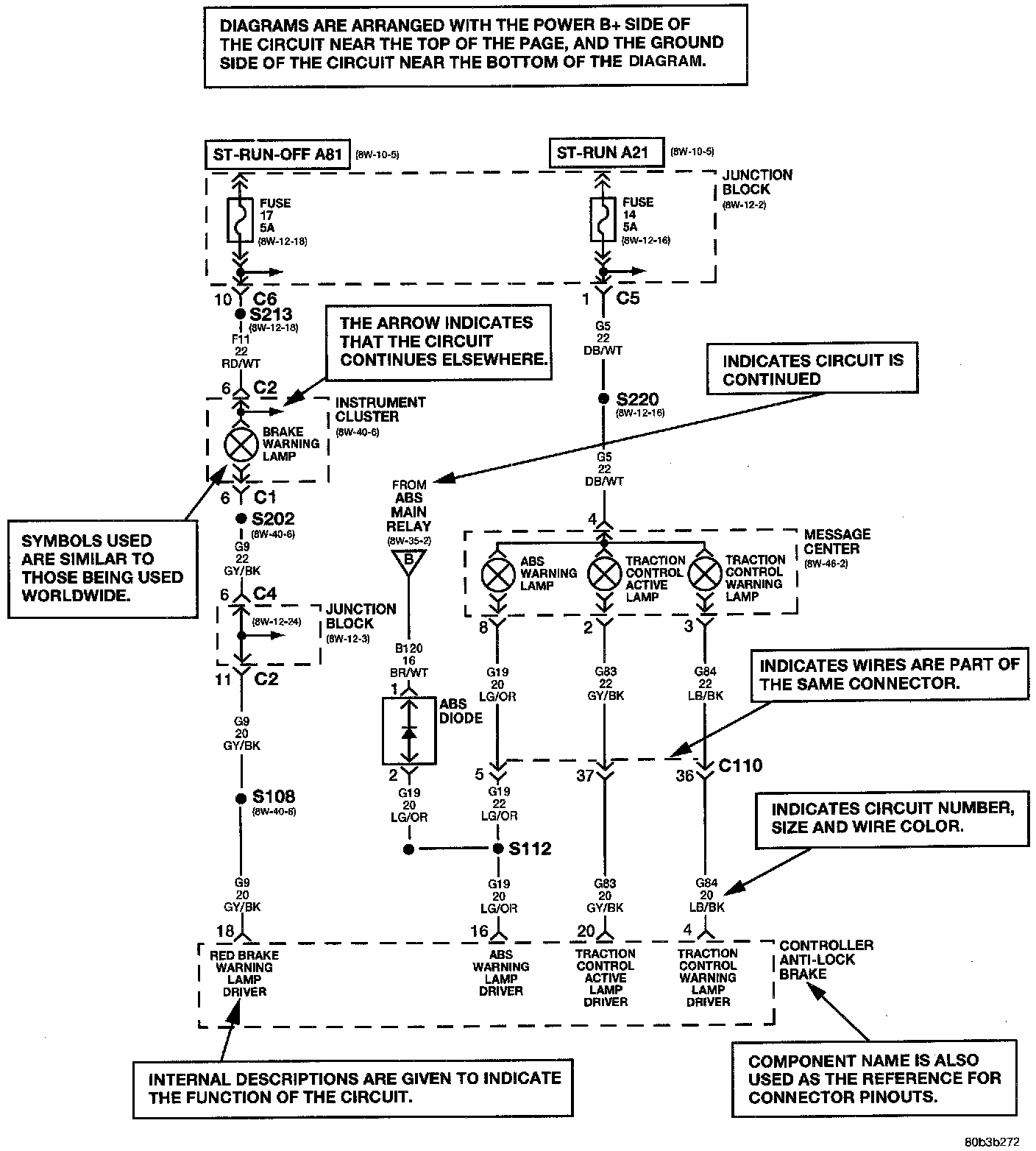 Diagrams are arranged such that the power (B+) side of the circuit is placed near the top of the page, and the ground (B-) side of the circuit is placed near the bottom of the page.