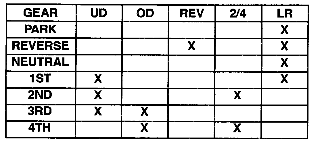 Theory of Operation: Four solenoids are used to control the friction elements (clutches). The continuity of the solenoids circuits are periodically tested. Each solenoid is turned on or off depending on it's current state. An inductive spike should be detected by the PCM during this test. If no spike is detected, the circuit is tested again to verify the failure. In addition to the periodic testing, the solenoid circuits are tested if a gear ratio or pressure switch error occurs. In this case, one failure will result in the appropriate code being set.