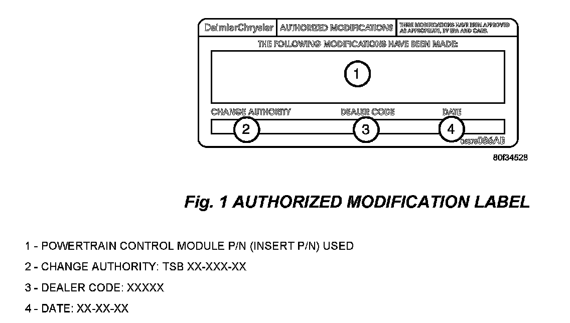 25. Type the necessary information on the "Authorized Modification Label" p/n 04275086AB and attach near the VECI label (Fig 1).