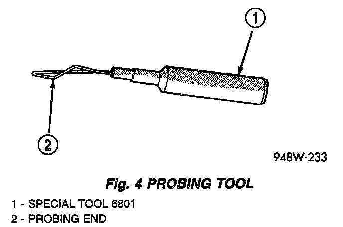 These tools are used for probing terminals in connectors (Fig. 4). Select the proper size tool from Special Tool Package 6807, and insert it into the terminal being tested. Use the other end of the tool to insert the meter probe.