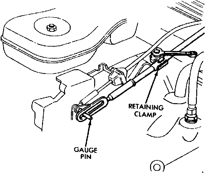 inch diameter pin between forward end of slot in cable end of carburetor linkage pin (hair pin clip removed from linkage pin). With choke in full open position and carburetor at curb idle, pull cable back toward dash panel without moving carburetor linkage until all freeplay is removed. Tighten cable clamp bolt to 45 inch pounds, remove 1/16 inch pin and install hair pin clip.