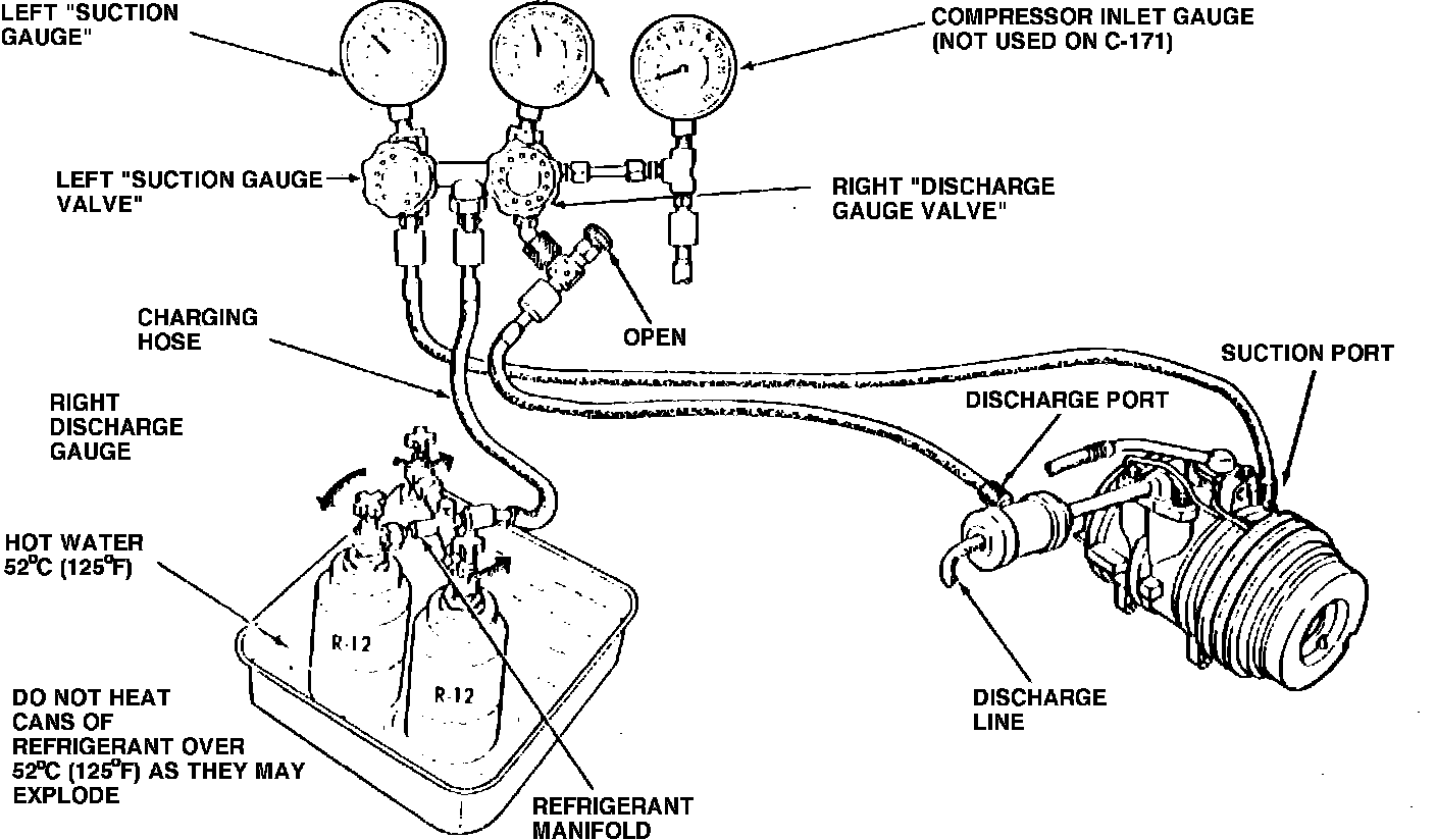 If required amount of refrigerant does not enter system, close compressor discharge valve on manifold gauge set. Turn charging bottle right side up so gas, not liquid, will enter system. Start engine and set A/C control in A/C position. Slowly open suction line valve on manifold gauge set. The compressor will draw refrigerant into system. Charging line valve should be set so suction pressure does not exceed 50 psig.