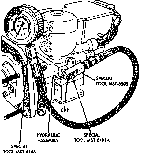 3. Install pressure gauge to hydraulic assembly adapter tool No. MST-6491A, into accumulator port of hydraulic assembly and torque adapter to 7.5 ft. lbs.