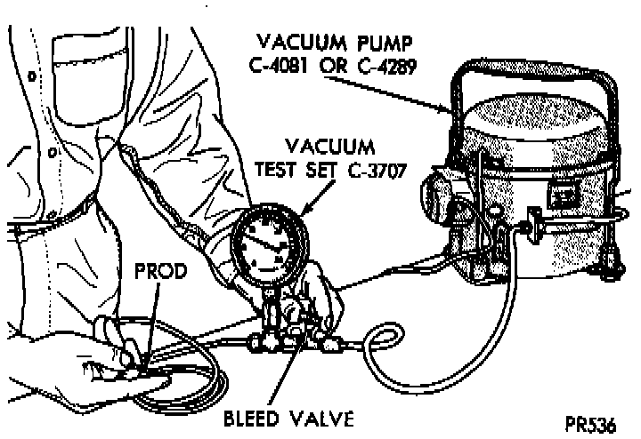 Use an adjustable Vacuum Test Gauge (C -3707) and a suitable vacuum pump to test heater A/C control vacuum. With a finger placed over the end of test hose, calibrate vacuum control valve on the test gauge to obtain -27 kPa (8 in. Hg.). Release and block the end of the test hose several times to verily vacuum setting.