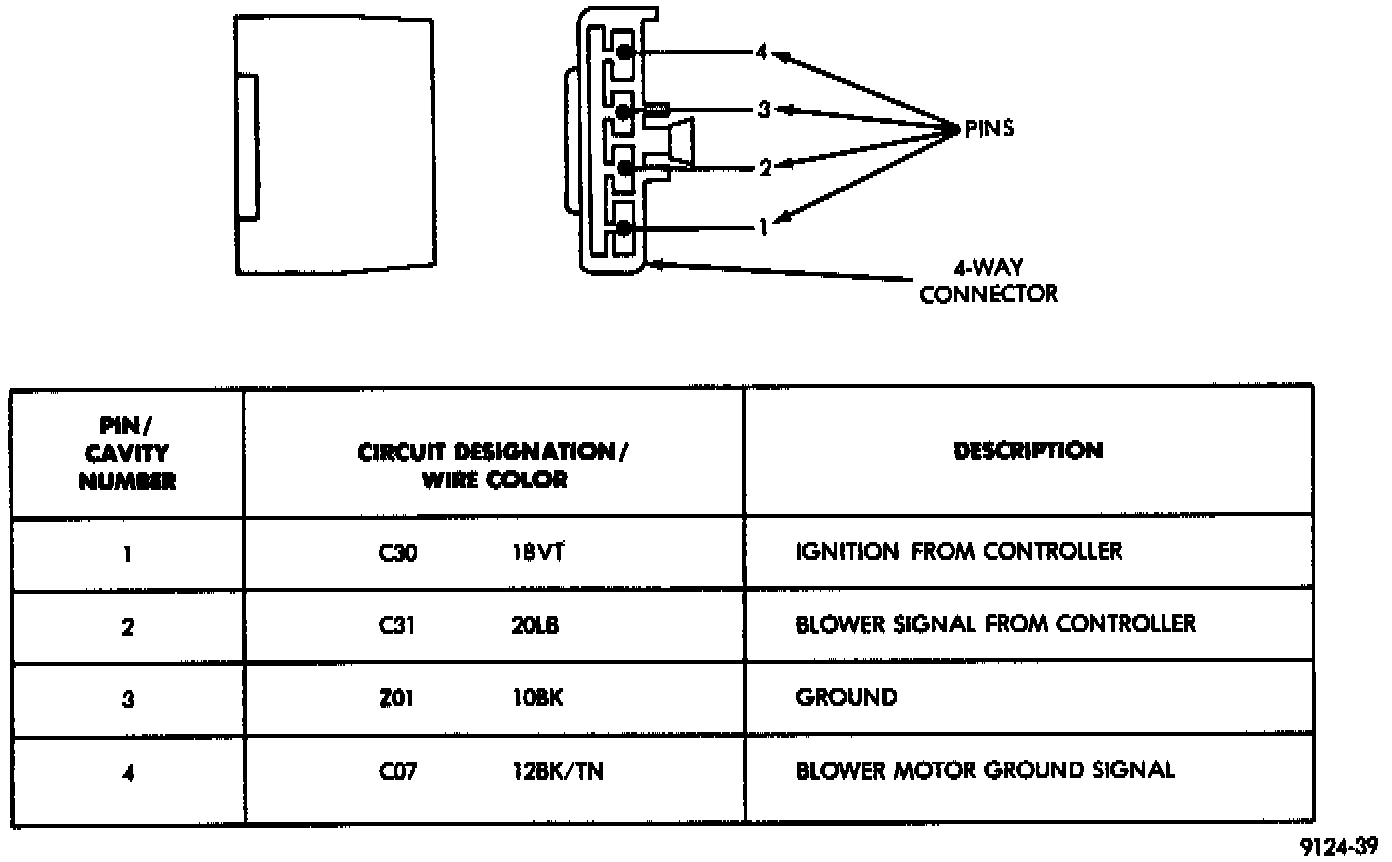 - With ignition ON, and the blower motor still connected, check for 12 volts to body ground on the black/tan wire of the blower motor two way connector.