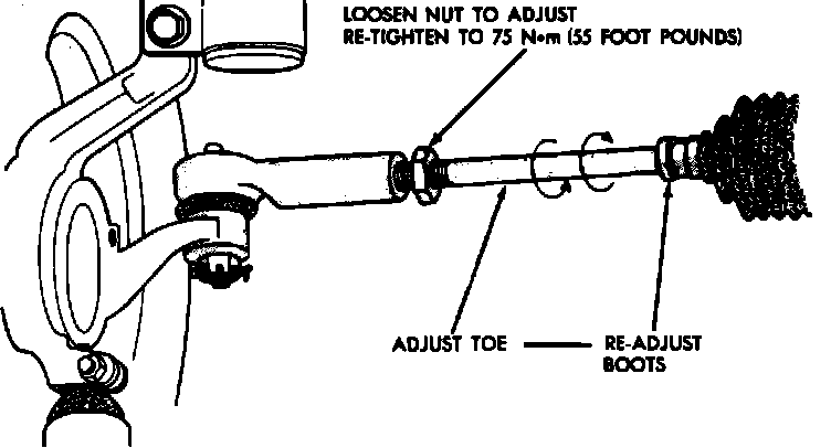 To adjust toe-in, center steering wheel and hold in position with a suitable tool. Loosen tie rod locknuts and rotate the rod, to adjust toe-in to specifications. Use care not to twist steering gear rubber boots. Torque tie rod locknuts to 55 lb-ft. Adjust position of steering gear rubber boots. Remove steering wheel holding tool.