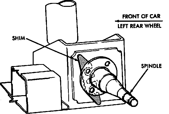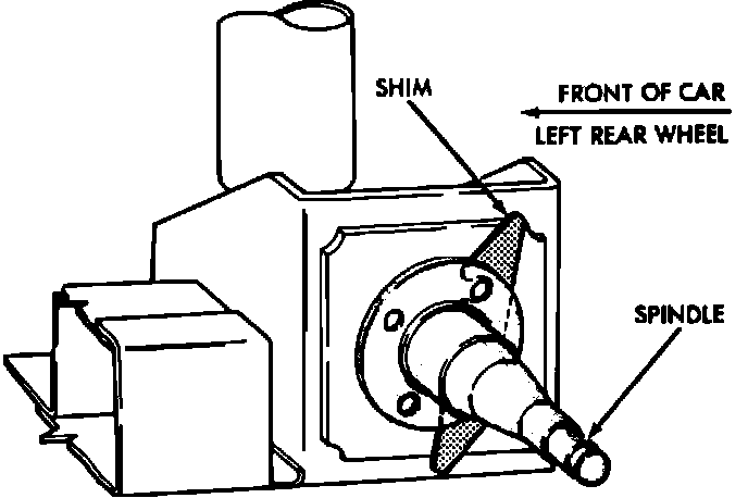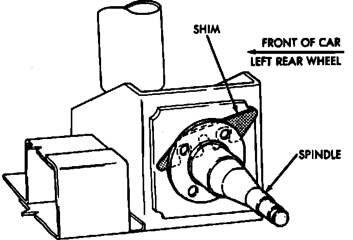 NOTE: Due to the design of the rear suspension and the incorporation of stub axles or wheel spindles, it is possible to adjust the camber and toe of the rear wheels on these models. Adjustment is controlled by adding shims approximately 0.010 inch thick between the spindle mounting surface and spindle mounting plate. The amount of adjustment is approximately 0.3° per shim. Proceed as follows: