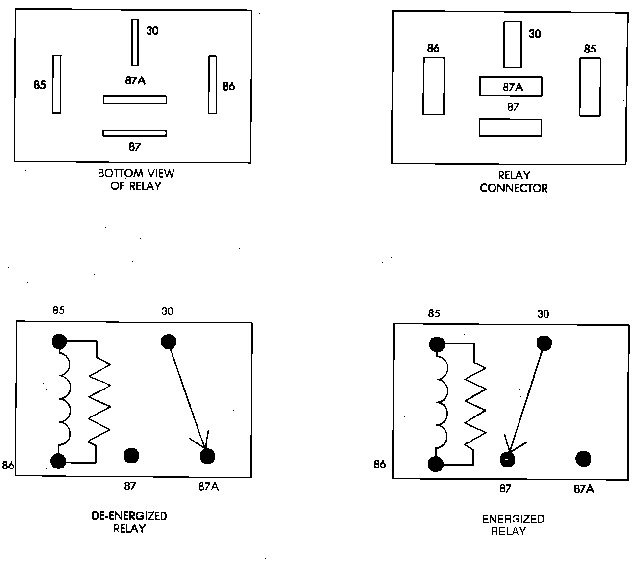 Z1 87 Green/blk. Connected to J1 circuit (terminal 30) in the energized position, supplies output voltage to fuel pump, O2 sensor, fuel injectors, and coil.