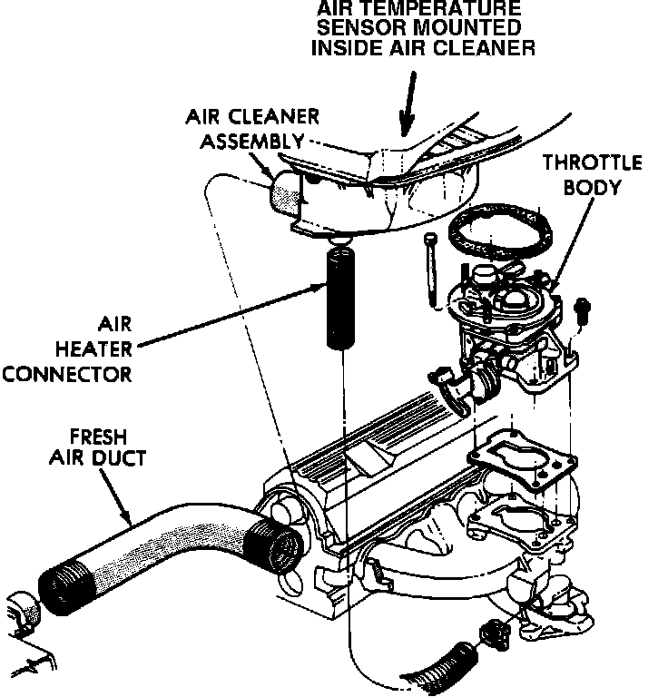 2. With engine cold and running, and ambient temperature in the engine compartment below 115°F, the heat control door in the heated air assembly should be in the up (heat on) position.