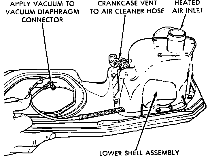5. To test the vacuum diaphragm, apply 20 inches of vacuum with a vacuum pump. The diaphragm should not bleed off more than 10 inches of vacuum in 5 minutes. The door should not lift off the bottom of the snorkel at less than 2 inches of vacuum and should be in full up (heat on) position with no more than 4 inches of vacuum. If diaphragm does not operate properly, replace diaphragm.