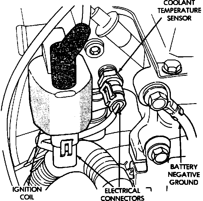 4. Disconnect coolant temperature sensor electrical connector on thermostat housing. The CHECK ENGINE lamp on the instrument panel should illuminate once this sensor has been disconnected. Coolant fan will come ON and stay ON throughout the procedure.