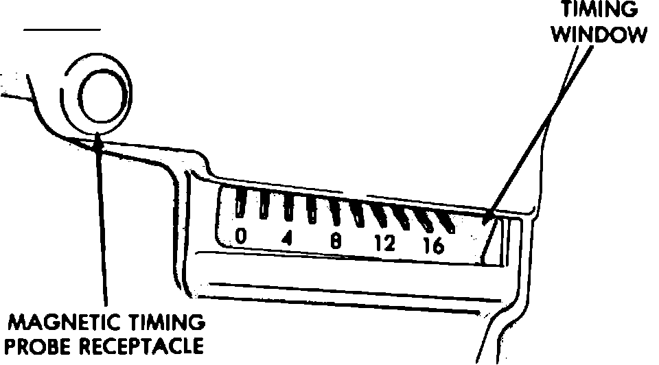 NOTE: There is an additional socket in the bellhousing of the transaxle, it is a socket for a magnetic timing probe. Do not set the timing through this socket with a standard timing light. This socket is positioned 10 degrees ATDC and will yield inaccurate timing specifications if used with a standard timing light.
