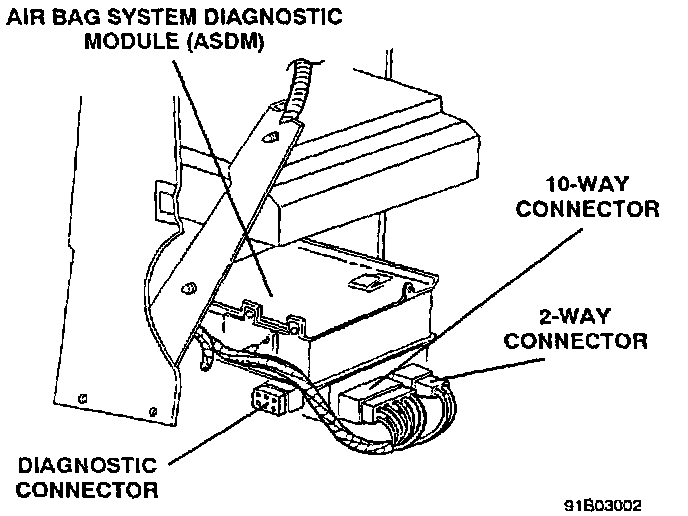 A. Connect the DRBII to the vehicle by plugging the DRBII connector into the ASDM diagnostic connector. The connector is located on the right side of the ASDM. The ASDM is mounted above the floor in the front of the passenger compartment directly below the center of the dash.