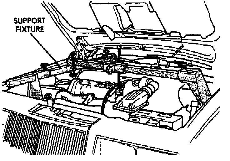 2. Install a lifting eye on battery ground strap bolt on left side of engine. Then install the engine support fixture as shown.