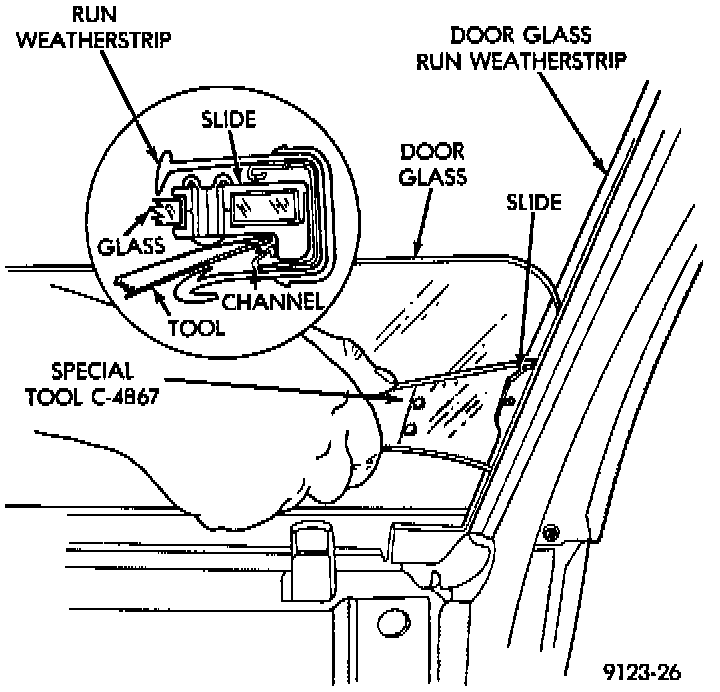 4. Insert door glass removal tool C-4867 between the glass slide and division run channel retaining lip at approximately 50 mm (2 in.) down from top rearward corner of glass. Push handle of tool toward glass to open channel. Pull forward on the glass to separate the slide from the channel.