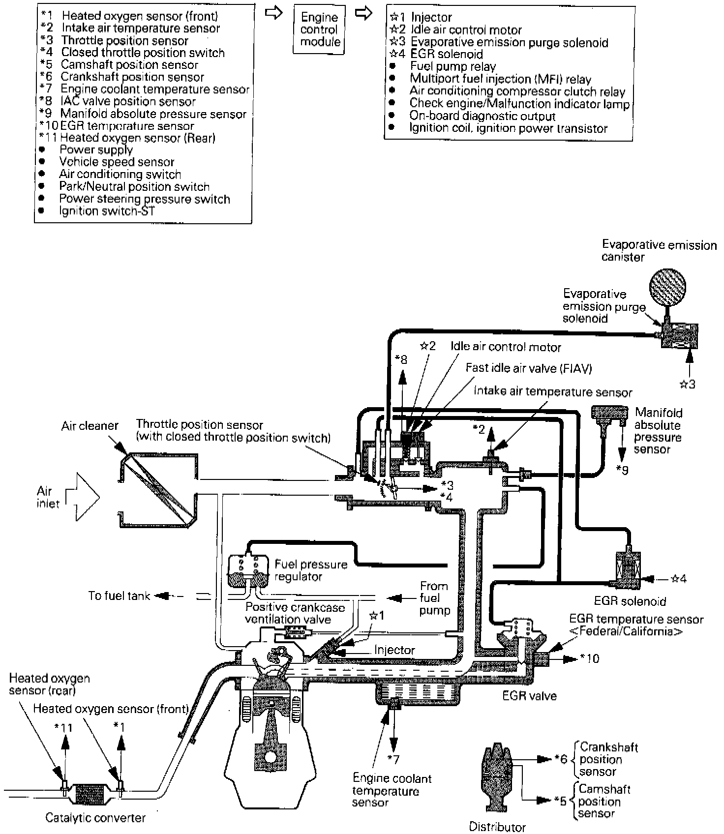 The multiport fuel injection (MFI) system consists of the sensors which detect the engine condition, the engine control module (ECM) which controls the engine on the basis of the sensor signals, and the actuators which operate under control of the ECM. The ECM controls the fuel injection, idle speed, ignition timing, etc. In addition, the ECM is provided with some diagnostic test modes (DTM) to facilitate troubleshooting in case of failure.