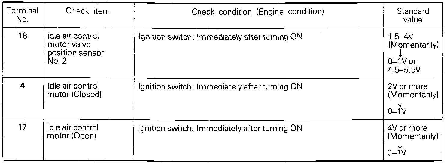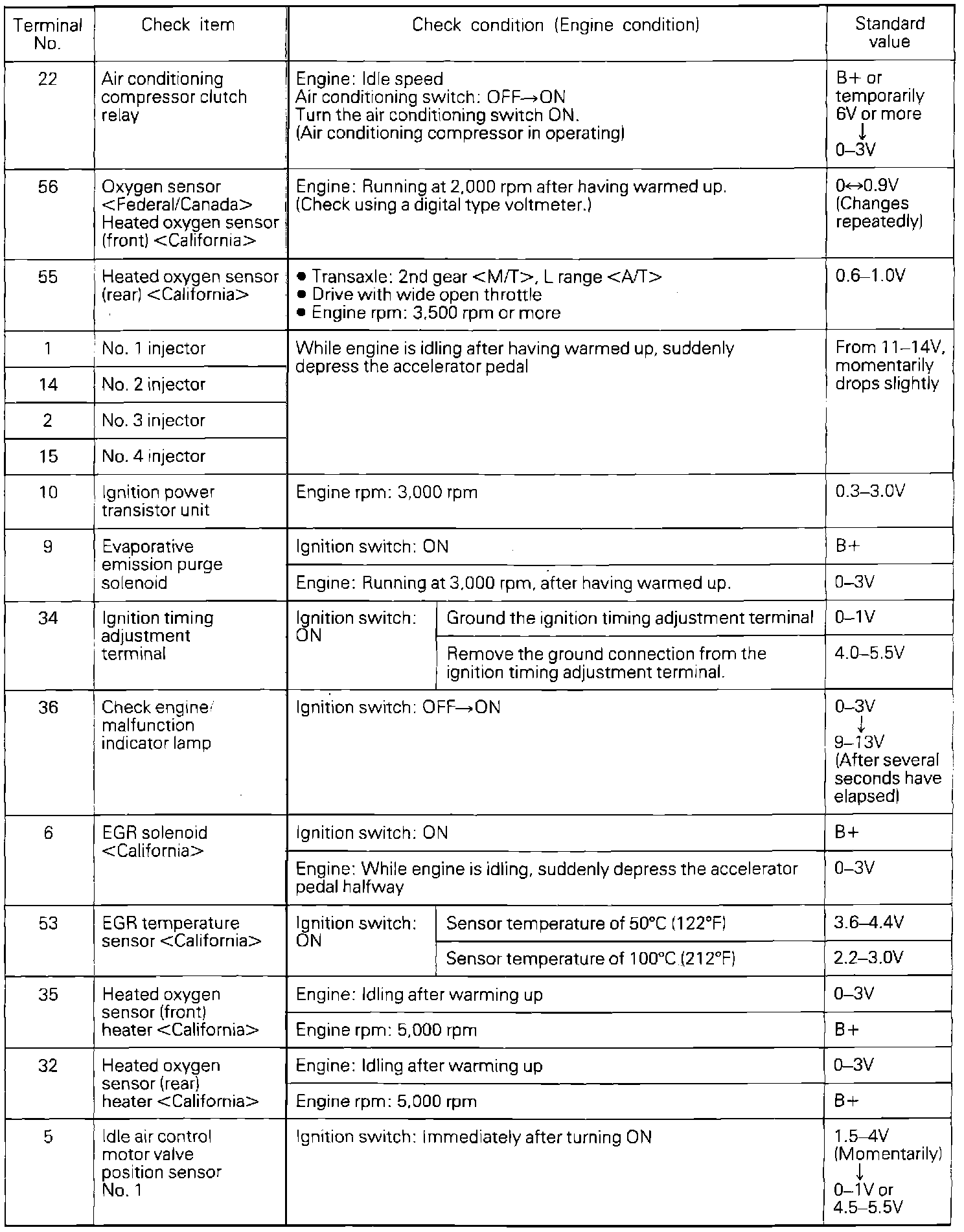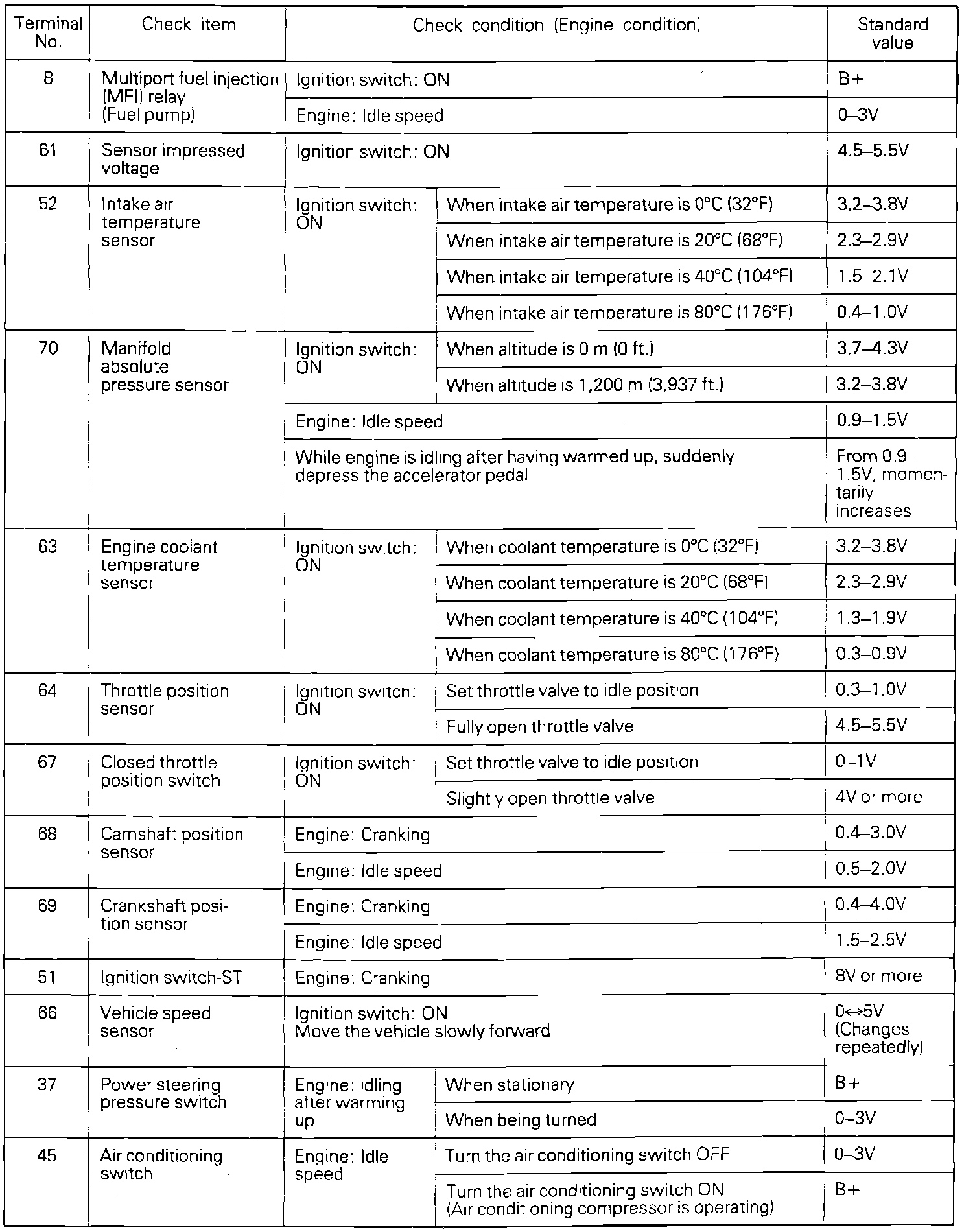 If voltage measured differs from that listed on the chart, check the corresponding sensor, actuator, or related electrical circuit. After repairs have been completed, recheck voltmeter readings to confirm that the repair has corrected the problem.